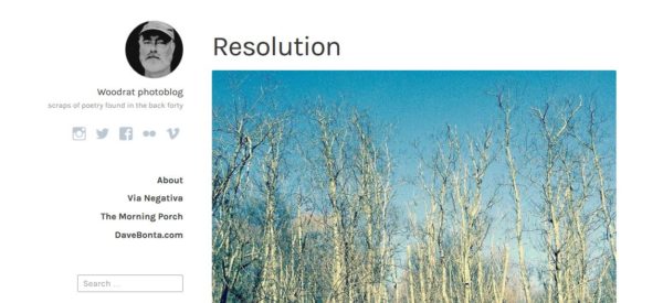 The two most recent posts from my photoblog, Woodrat photohaiku. If you’d like more of this kind of thing, there’s an emailed version you can subscribe to, just as with Via Negativa, The Morning Porch, and my writer’s blog, DaveBonta.com (which bizarrely has more subscribers than the photoblog). I generally post a couple dozen times a year, more in the winter than in the summer.